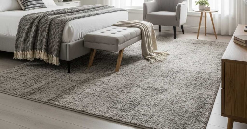A soft rug instantly makes a bedroom feel more comfortable. Rugs add warmth, reduce noise, and visually anchor furniture.