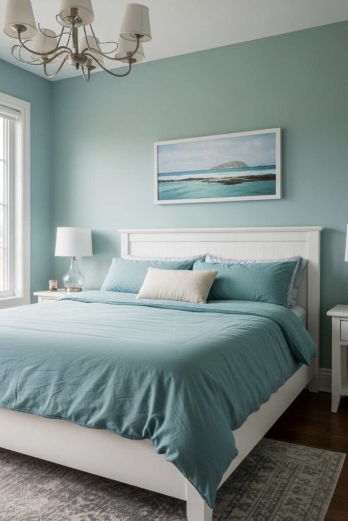 Blue-green tones combine the calm of blue with the healing qualities of green. When muted, they create one of the most effective peaceful bedroom paint color ideas for mental clarity and rest.