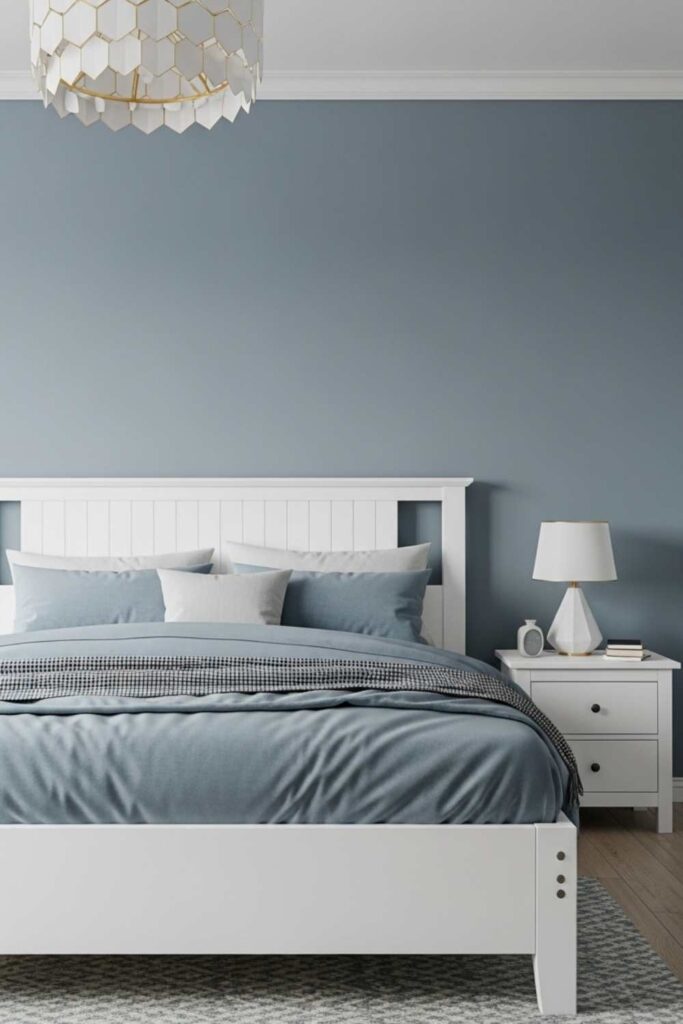 Warm white plays a crucial supporting role in this palette. Instead of stark or cool white, warmer undertones keep the bedroom from feeling cold or sterile. The balance between blue and white allows the space to feel open while still emotionally comforting, which is essential for long-term bedroom comfort.