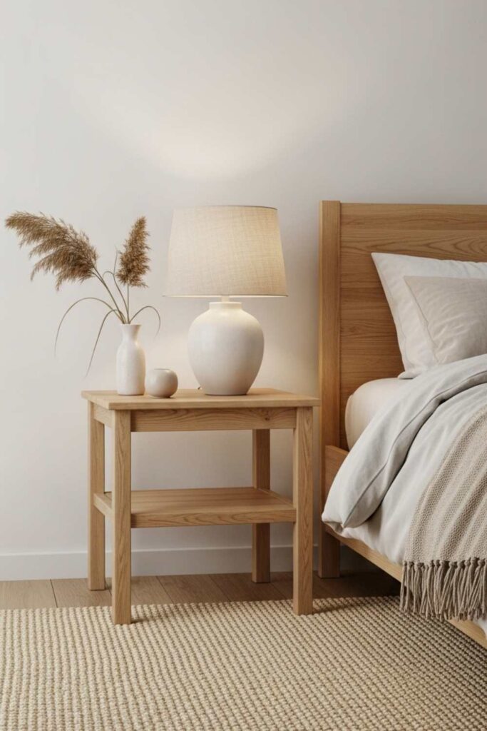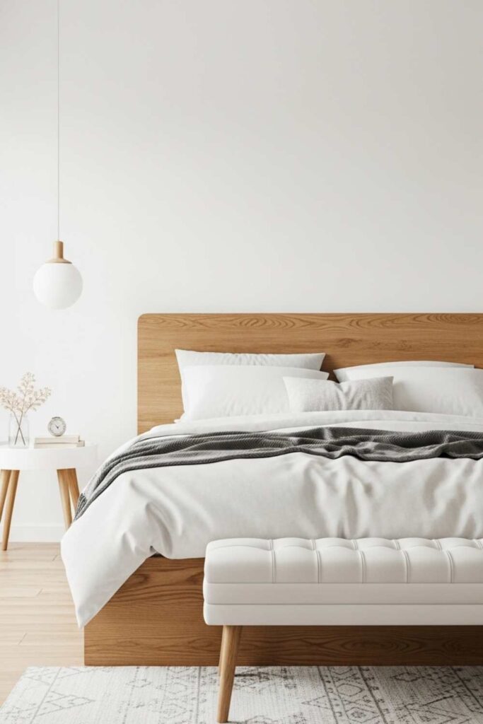 Wood introduces warmth and grounding, helping the bedroom feel emotionally safe. This combination is often used in minimalist bedroom decor focused on calm living.