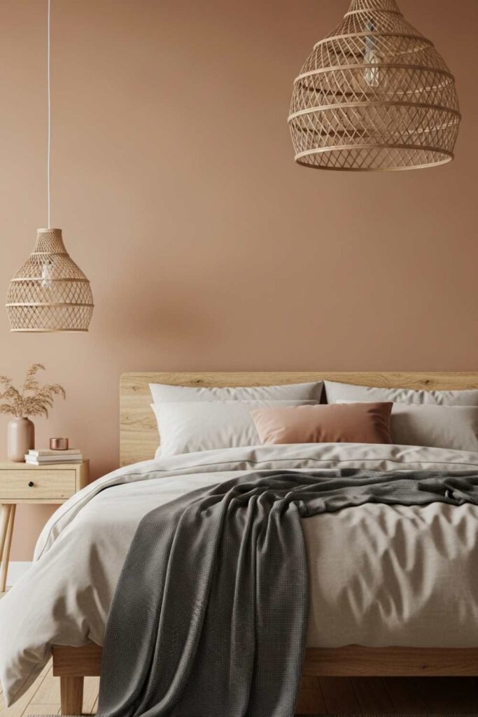 Light earth tones such as sand, clay, and muted brown connect the bedroom to nature. These colours feel grounding and emotionally steady.