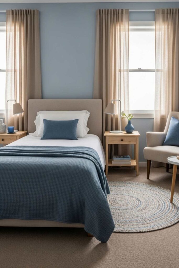Soft blue calms the mind, while beige adds warmth and approachability. This balance prevents the bedroom from feeling cold or overly neutral.