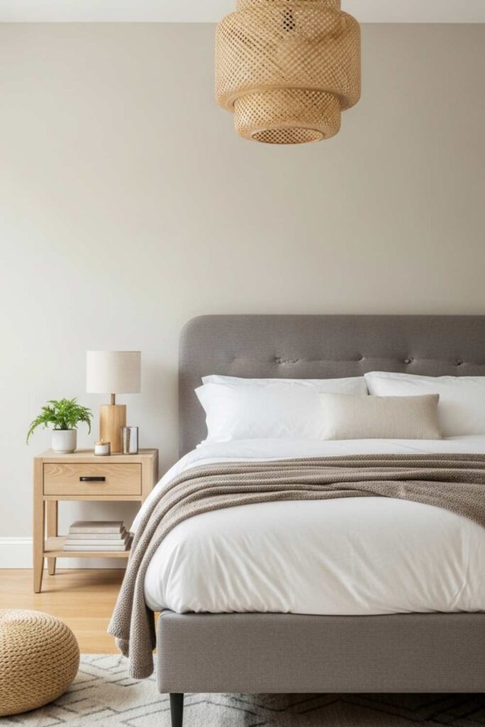 Soft white opens up the bedroom and reflects light gently. When paired with natural wood tones, it avoids feeling clinical or empty.