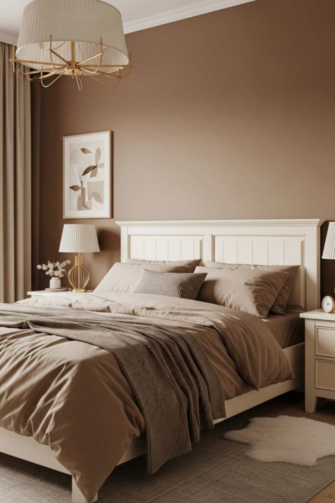 Warm cream paired with soft brown tones creates a bedroom that feels emotionally grounding. Brown is associated with stability and security, while cream ensures the space remains light and welcoming.