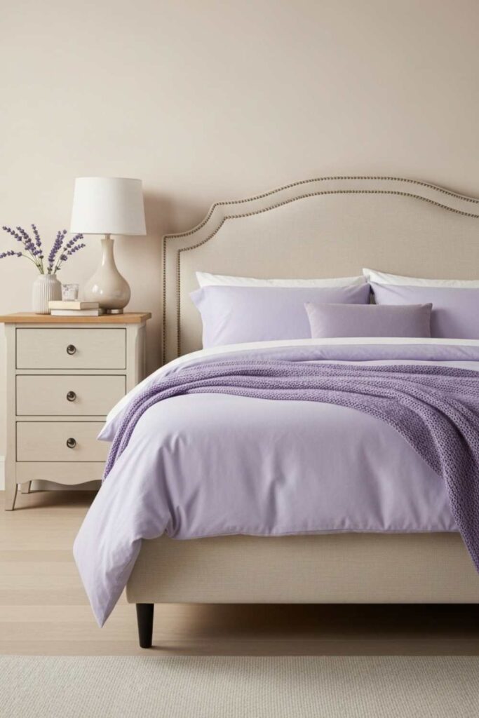 7. Soft Lavender and Warm Neutral Bedroom Palette