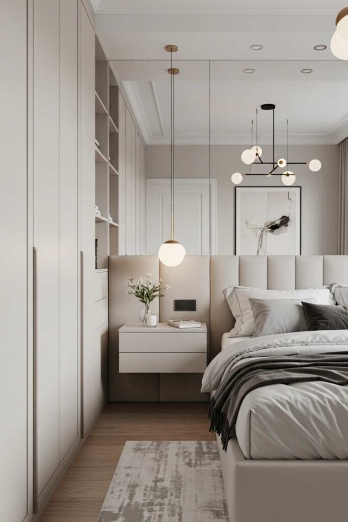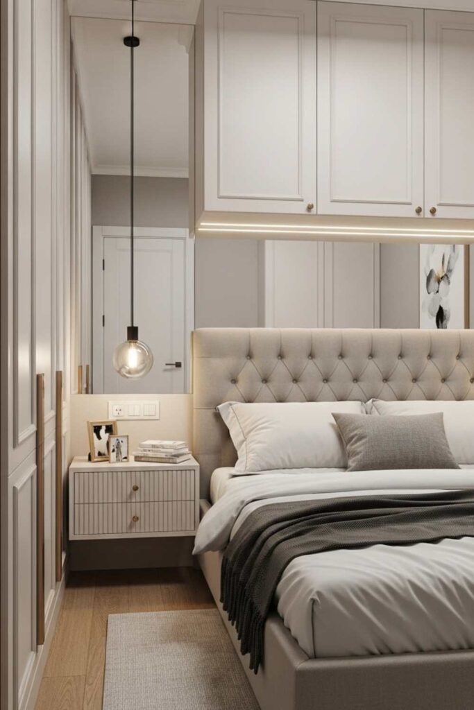 Light colors, mirrors, and soft lighting help visually expand the room. The bedroom feels thoughtfully designed rather than constrained.
