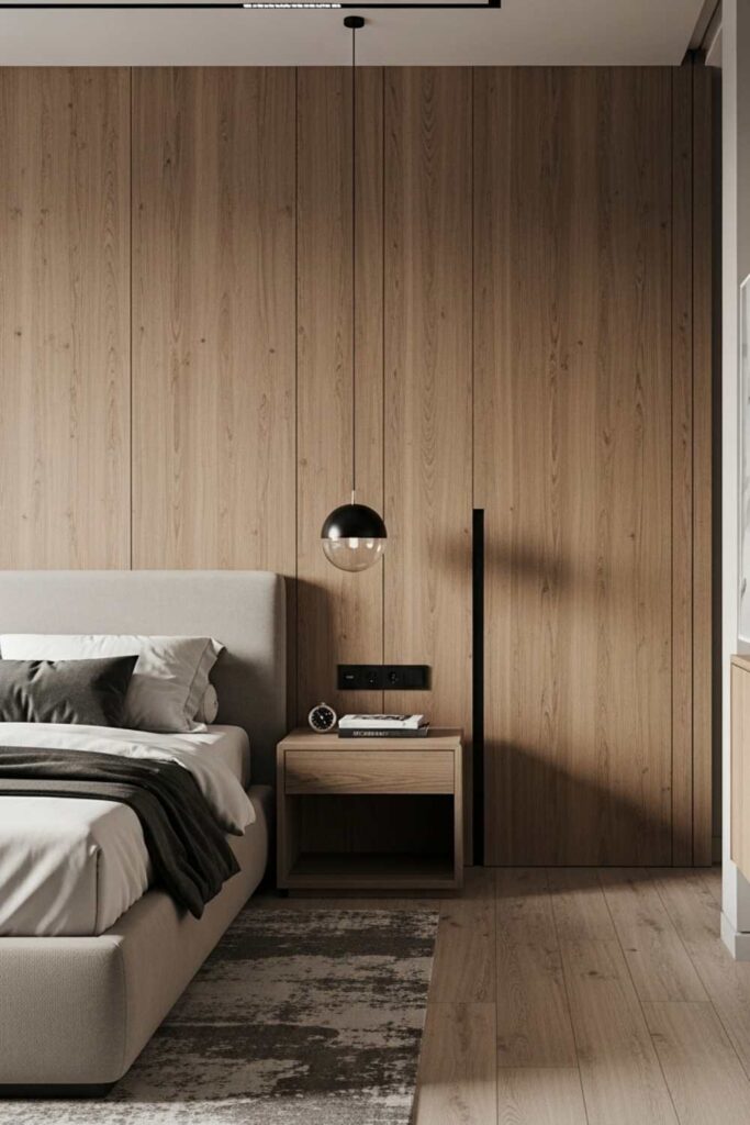Wood panel headboards, bedside tables, or flooring create a grounded and organic atmosphere. The space feels calm and timeless.