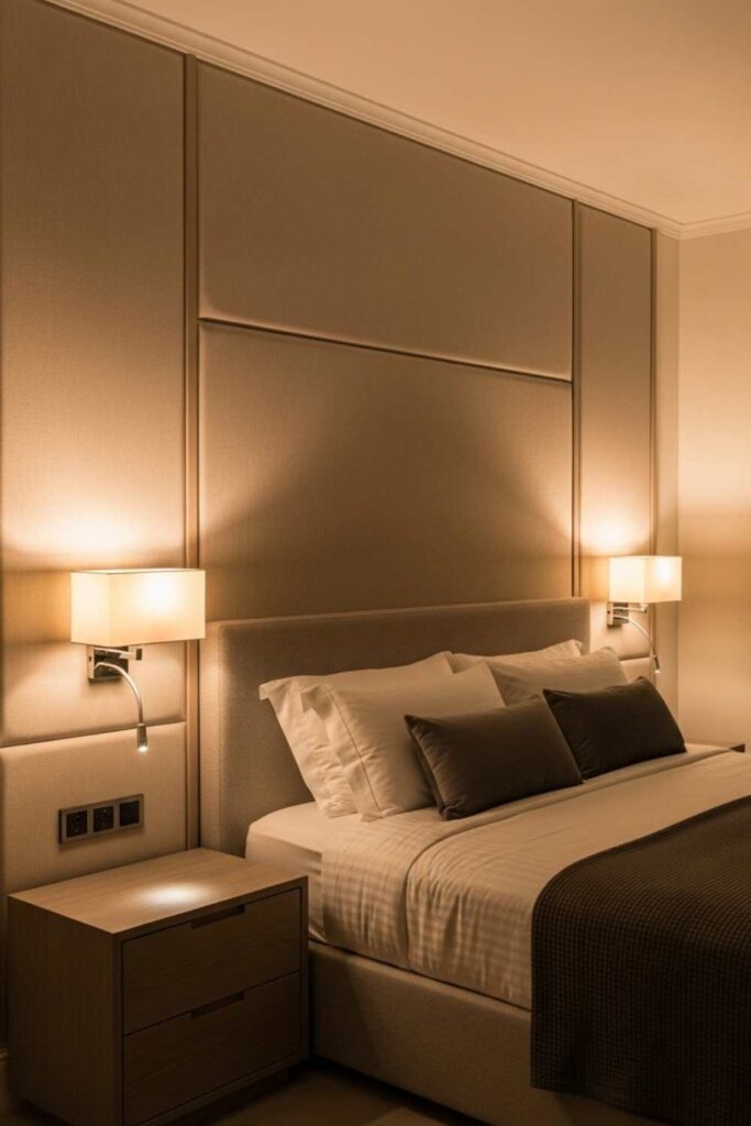 Wall sconces, bedside lamps, concealed LED strips, and dimmable fixtures allow the bedroom to transition smoothly from daytime functionality to nighttime relaxation. Warm light tones soften the room and reduce visual stress.