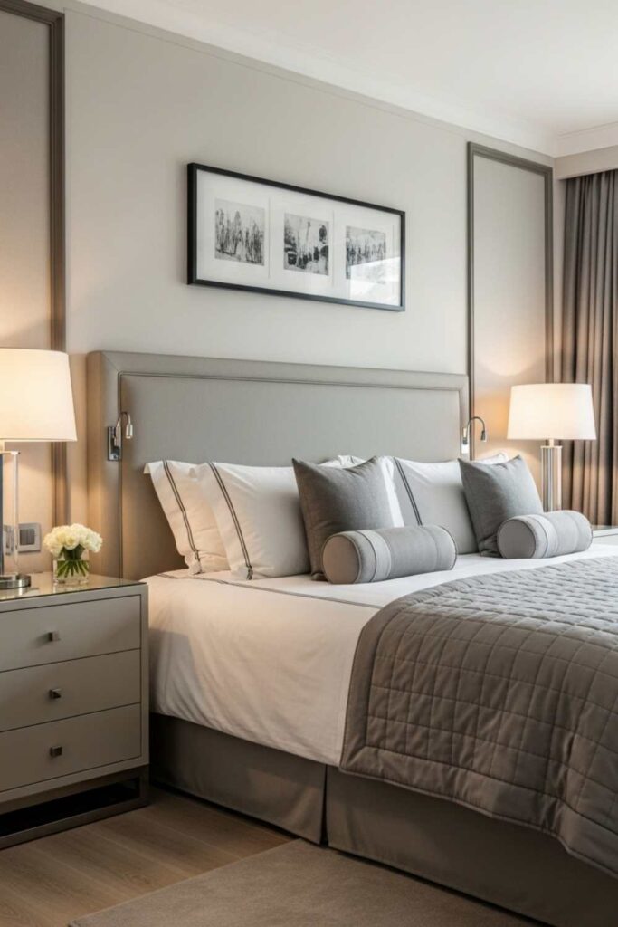 Crisp bedding, layered pillows, neutral palettes, and balanced furniture placement create that familiar luxury hotel atmosphere. Subtle metallic accents and soft lighting complete the look.