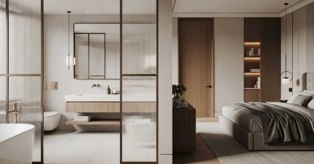 A refined luxury bedroom design with bathroom often begins with spatial flow. Rather than fully closing off the bathroom, subtle architectural dividers such as fluted glass panels, partial walls, or sliding wooden partitions maintain visual continuity while preserving privacy. This approach allows natural light to travel freely between areas, making the entire suite feel expansive and breathable.