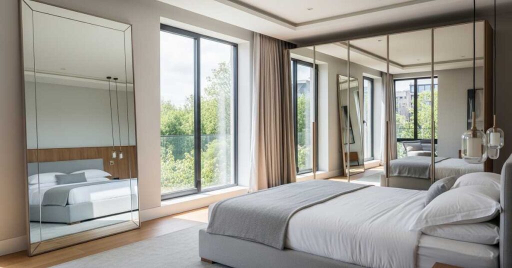 Mirrors amplify natural light and visually expand both bedroom and bathroom zones. Large framed mirrors or full height mirrored wardrobe panels increase brightness and depth within the suite.