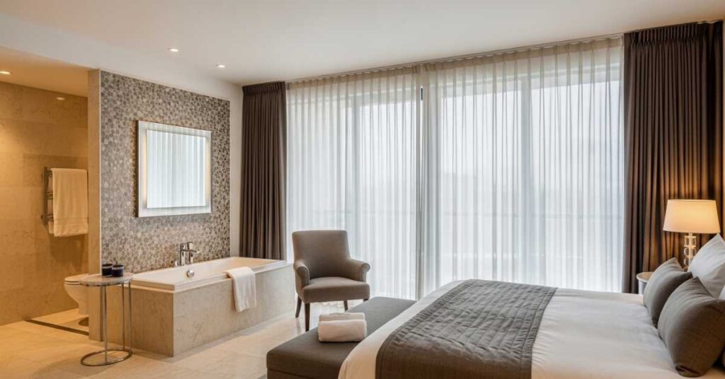 In a luxury bedroom design with bathroom, textiles balance the harder surfaces found in stone and tile. This layering prevents the space from feeling sterile and instead encourages comfort.