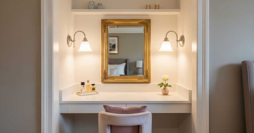 A dedicated vanity niche integrated into the suite adds functionality and elegance. Whether part of a luxury bedroom design for girl or a master suite, this corner can feel intimate and refined.