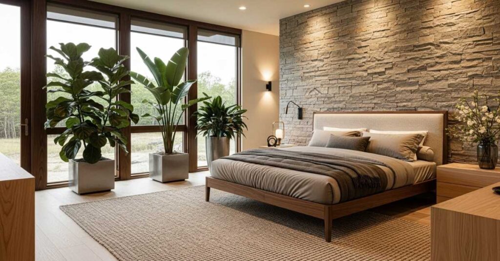 Modern luxury bedroom design benefits from organic textures that enhance relaxation while preserving sophistication.