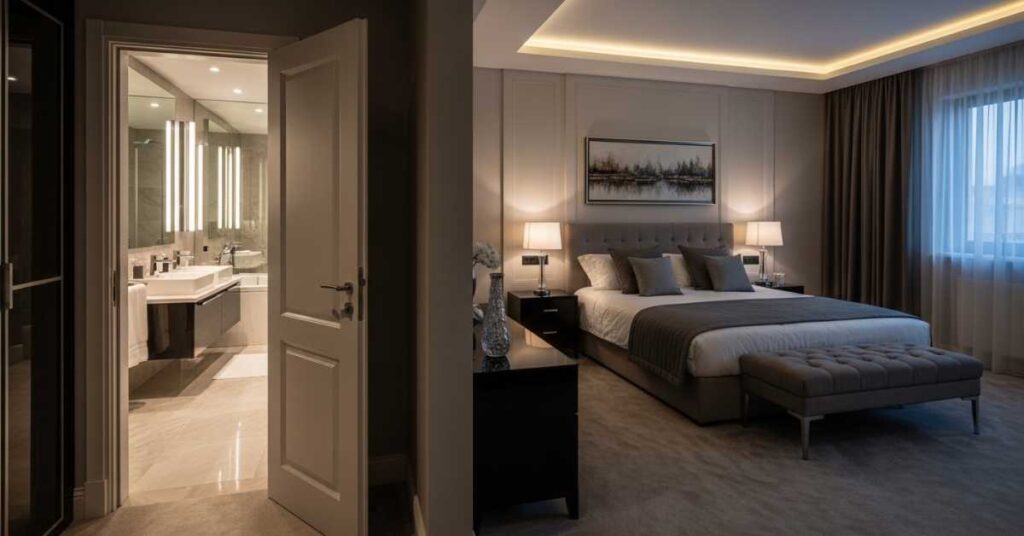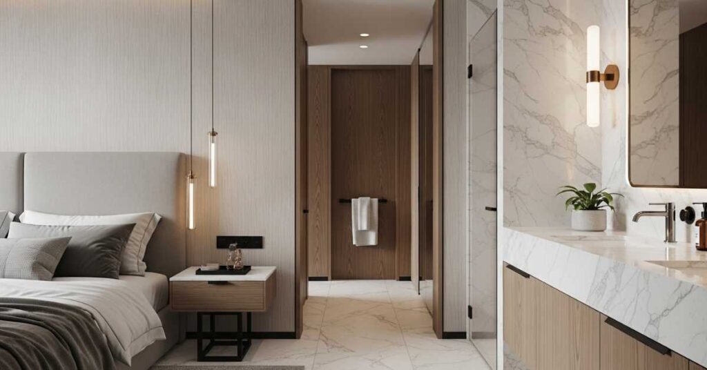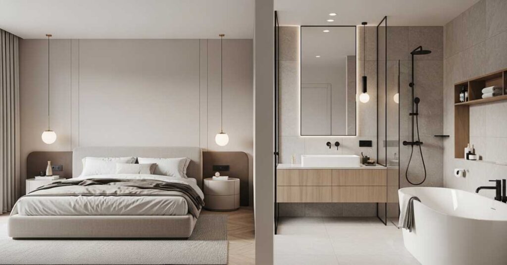 Color harmony plays a powerful role in a successful luxury bedroom design with bathroom. Soft warm whites, muted beige, gentle greys, and light taupe tones create a unified atmosphere that feels calm and enduring. When these shades flow from the bedroom into the bathroom, the suite feels thoughtfully curated rather than divided into two different moods.