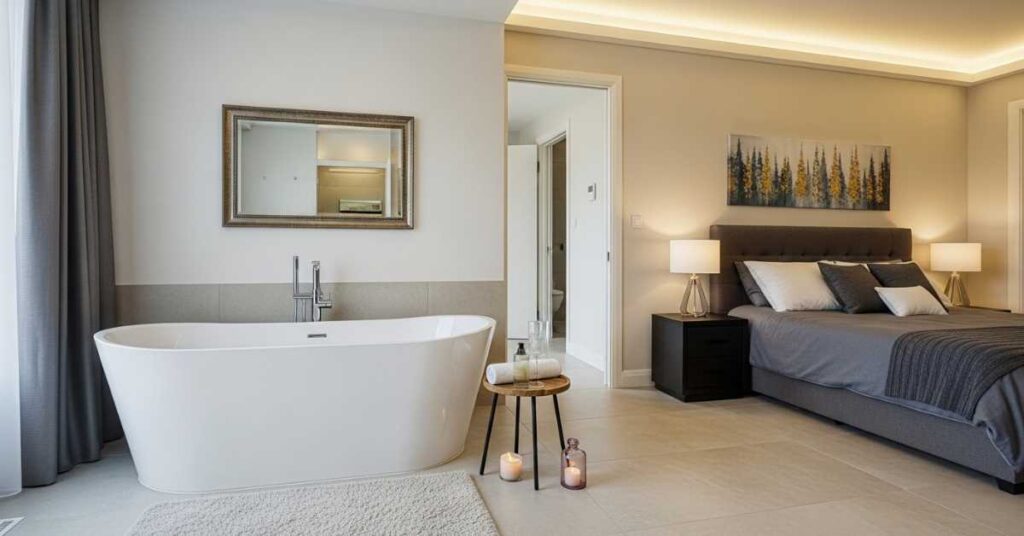 A freestanding bathtub positioned within view of the bedroom transforms the suite into a spa like retreat. In a luxury bedroom design with bathroom, the tub becomes both functional and artistic. Placing it near a window or beneath soft lighting enhances the sense of calm.