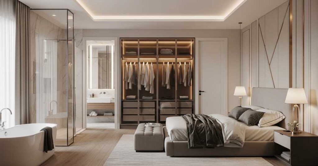 A modern luxury bedroom design with wardrobe integrated between the bedroom and bathroom creates practical flow. This layout supports privacy while maintaining efficiency. It allows you to move naturally from sleeping area to dressing area to bathing space without disrupting the room’s calm.