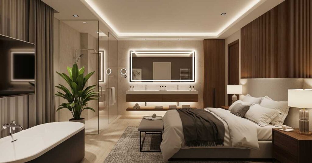Lighting shapes mood more than any decorative element. A well designed luxury bedroom design with bathroom incorporates layered lighting that adapts throughout the day. Soft bedside lamps, recessed ceiling lights, subtle LED strips under vanities, and warm accent lighting create depth without glare.