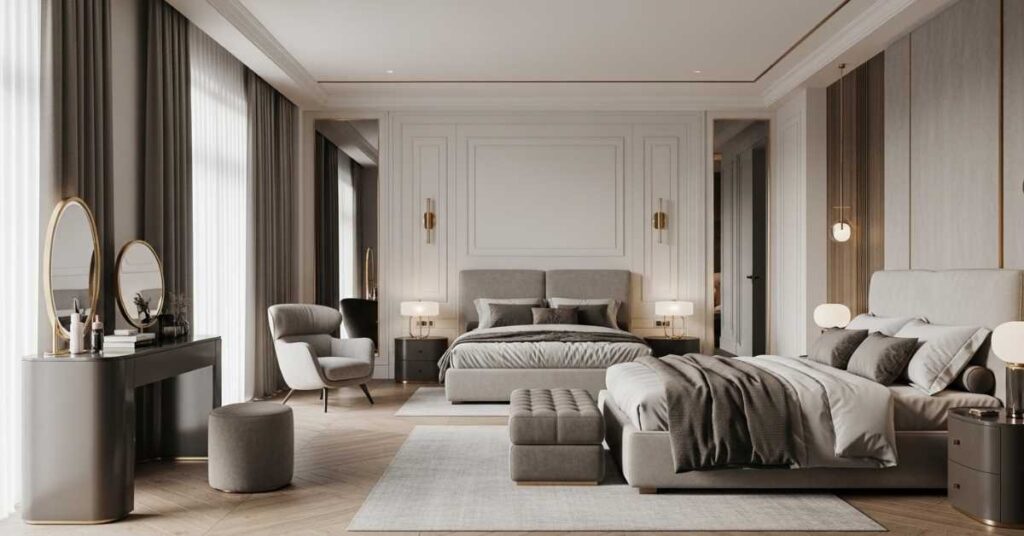 Master modern luxury bedroom design emphasizes proportion. Furniture should complement architectural lines and support movement through the suite. When every piece has purpose, the luxury bedroom design with bathroom feels intentional and balanced.