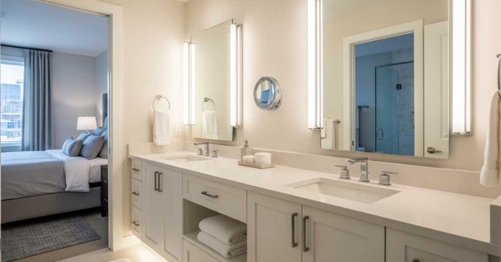 In shared suites, a double vanity enhances practicality while preserving elegance. Clean cabinetry with stone or quartz surfaces offers both beauty and functionality. Ample counter space ensures morning routines remain smooth and unhurried.