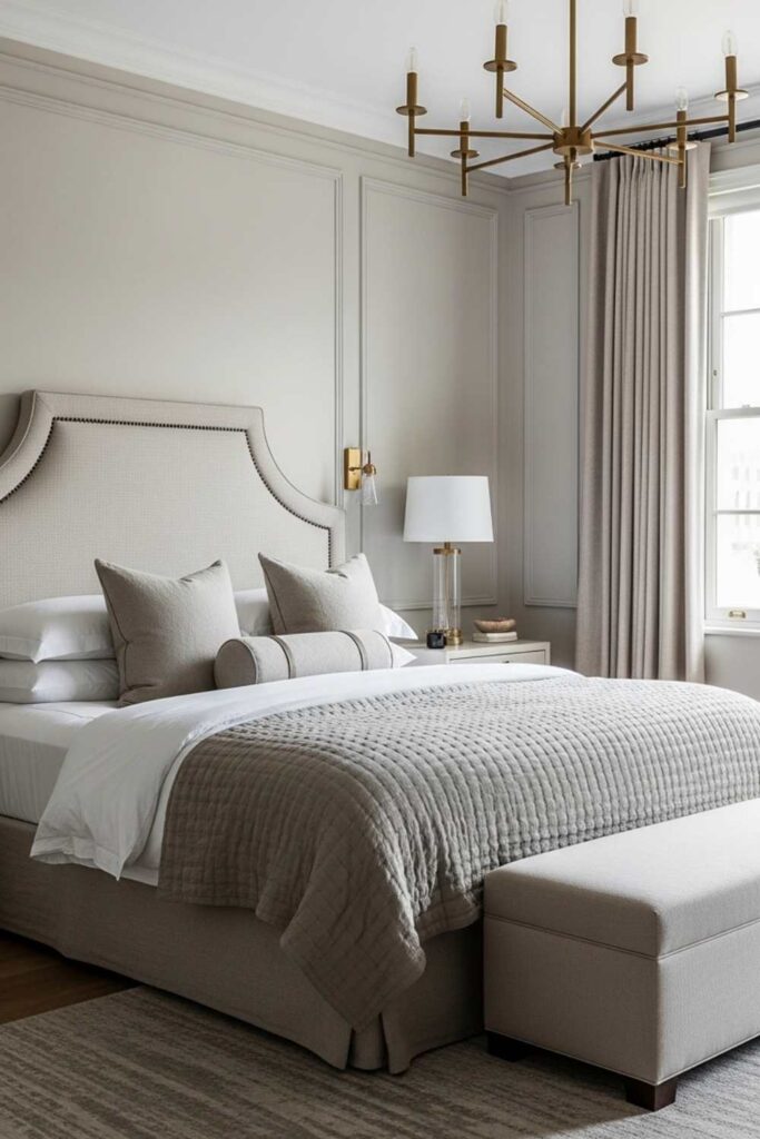 Texture becomes the defining feature in this style. Upholstered headboards, layered linen bedding, soft wool rugs, and flowing curtains add depth without visual clutter. Each material contributes to a sense of quiet richness, making the room feel expensive through comfort rather than decoration.