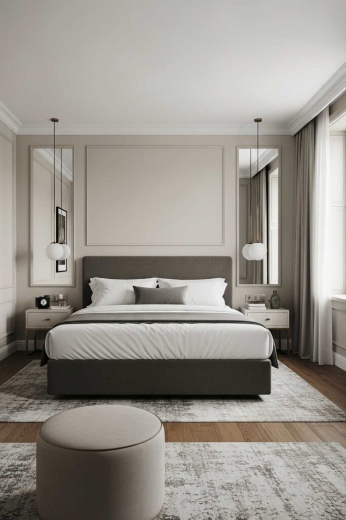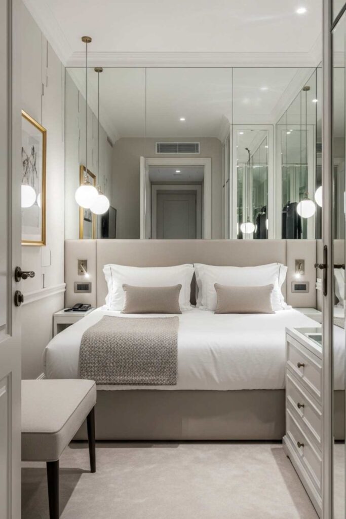 Mirrors expand visual depth, while integrated storage prevents clutter. Furniture is scaled appropriately to avoid crowding, allowing the room to feel intentional rather than constrained.