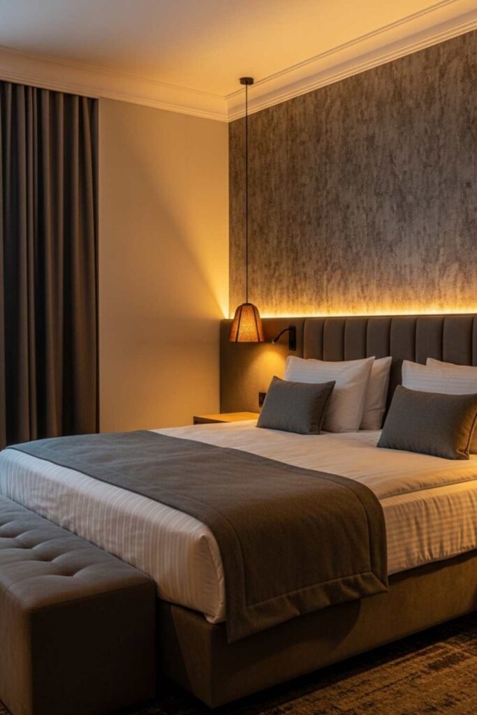 Lighting defines the emotional tone of a boutique hotel bedroom more than any furniture piece. Warm ambient lighting creates intimacy, softness, and a sense of safety that guests subconsciously associate with comfort. Harsh overhead lighting is avoided in favour of layered illumination.