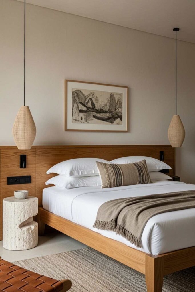 Wooden bed frames, stone side tables, and textured fabrics balance modern lines with organic comfort. The room feels curated but not forced, refined yet deeply human in its appeal.