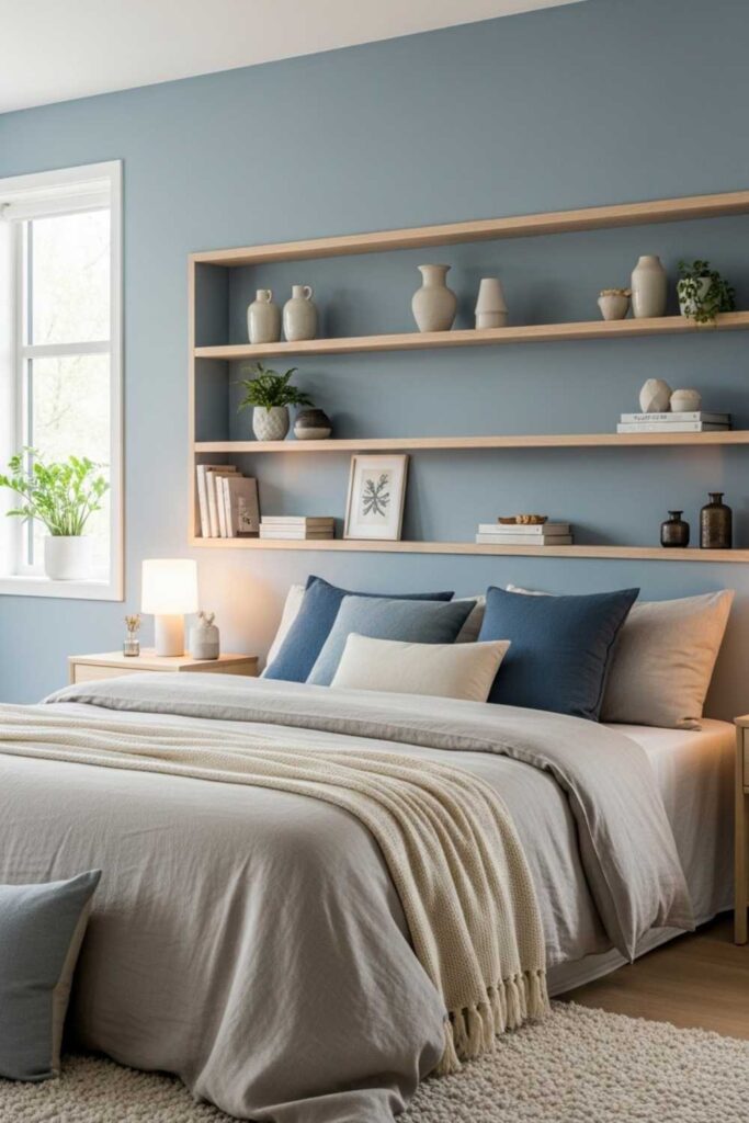 Shelving above the bed can work beautifully when styled with restraint. Instead of heavy cabinets, slim shelves allow storage while keeping the bed area open and breathable.