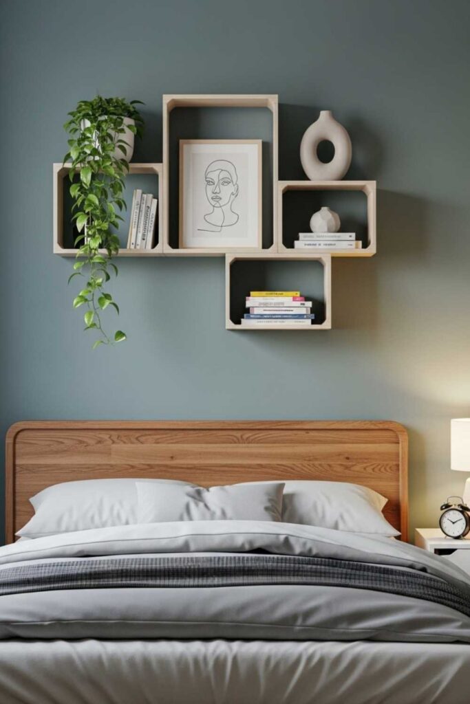 This approach is popular in modern bedroom shelving ideas Pinterest, especially in Scandinavian and Japanese-inspired interiors. The shelves often hold framed art, soft decor, or minimal book arrangements.