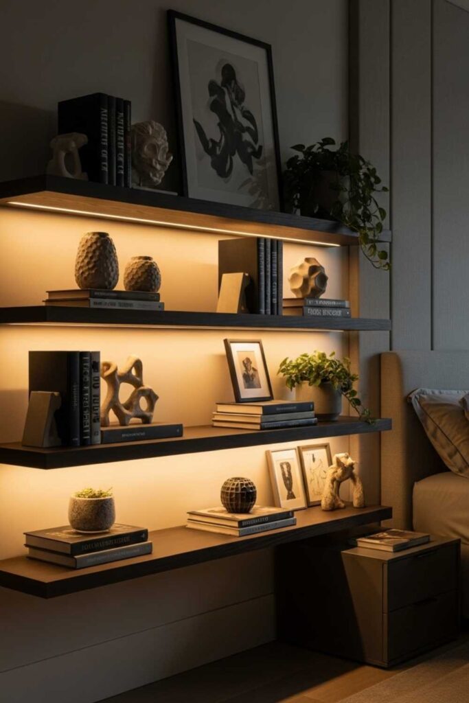 Shelves with integrated lighting add both function and mood. Soft LED strips under shelves highlight decor while creating ambient light.