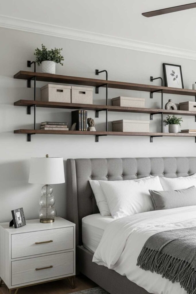 Safety and symmetry are key here. When shelves are aligned and lightly styled, they enhance the room’s design instead of overpowering the sleeping space.