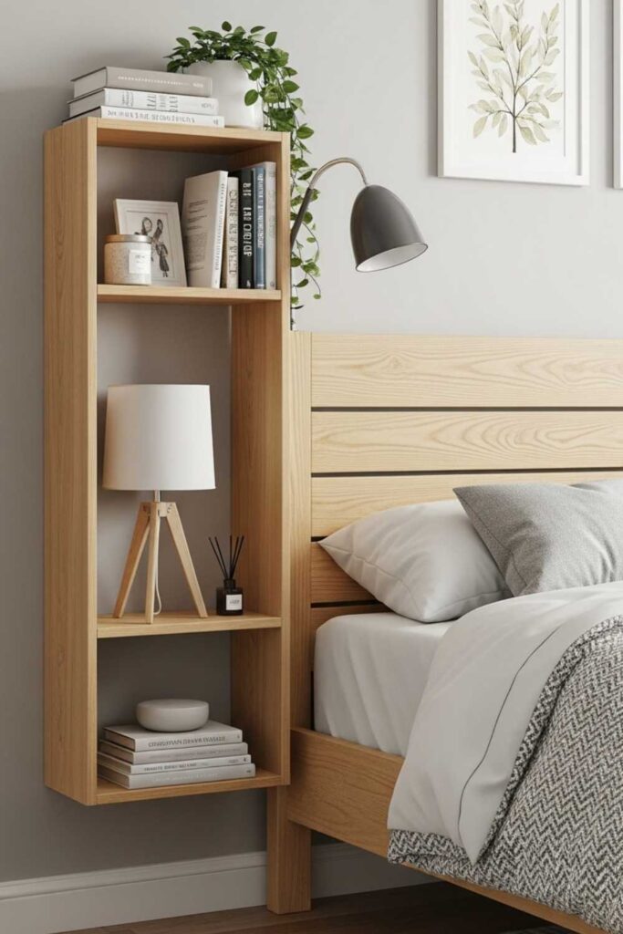 Replacing nightstands with bedside shelving is a smart solution for compact bedrooms. Shelves mounted beside or above the bed free up floor space while keeping essentials within easy reach.
