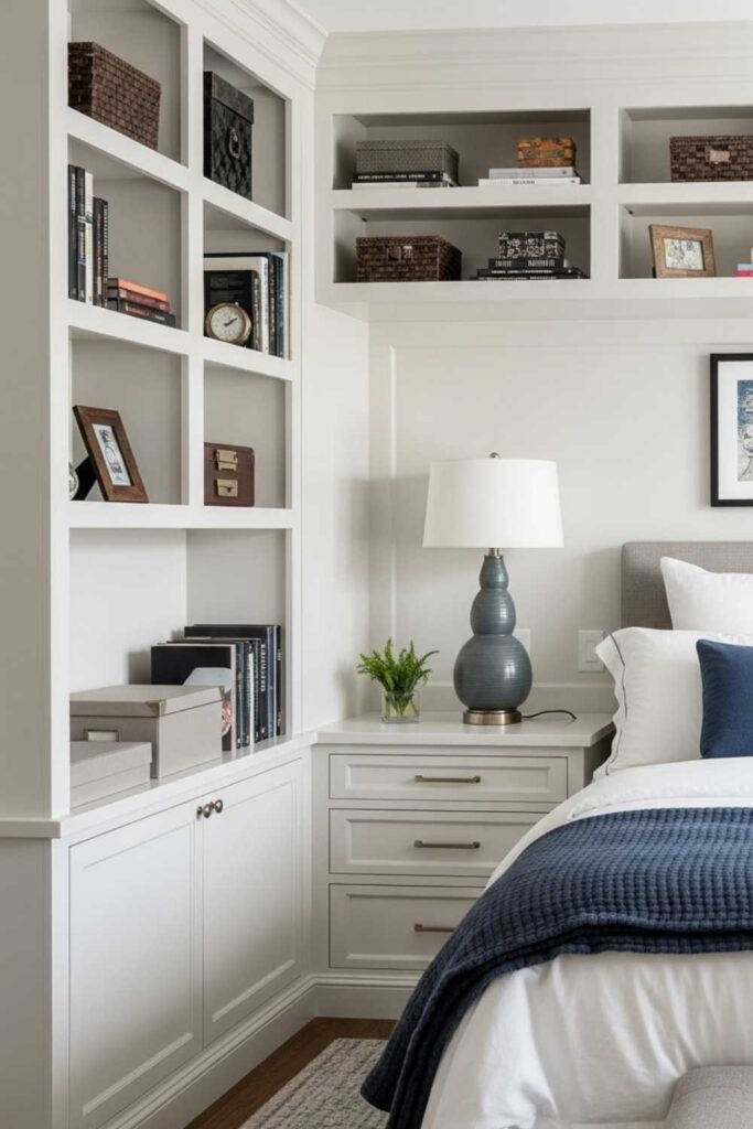 Built-in shelving creates a custom, high-end look that instantly elevates the bedroom. These shelves are designed to fit into wall niches or surrounding the bed, offering storage without breaking the room’s flow.