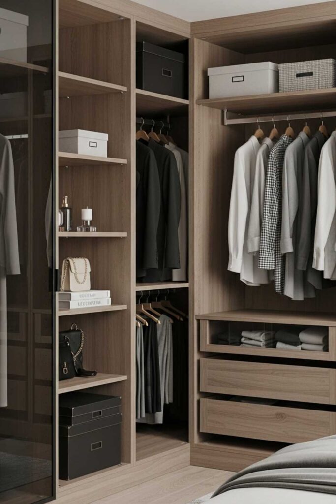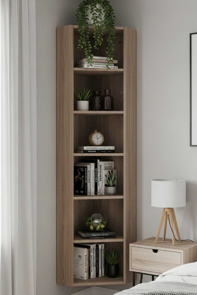 Corners are often wasted in bedroom layouts, but corner shelving turns these overlooked areas into functional storage zones. Vertical corner shelves are ideal for books, plants, or decorative accents.