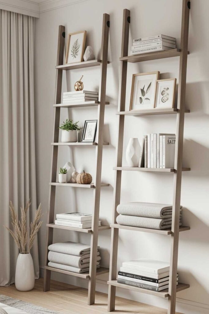 Ladder shelves lean against the wall and provide vertical storage without heavy installation. They are perfect for renters or flexible spaces.