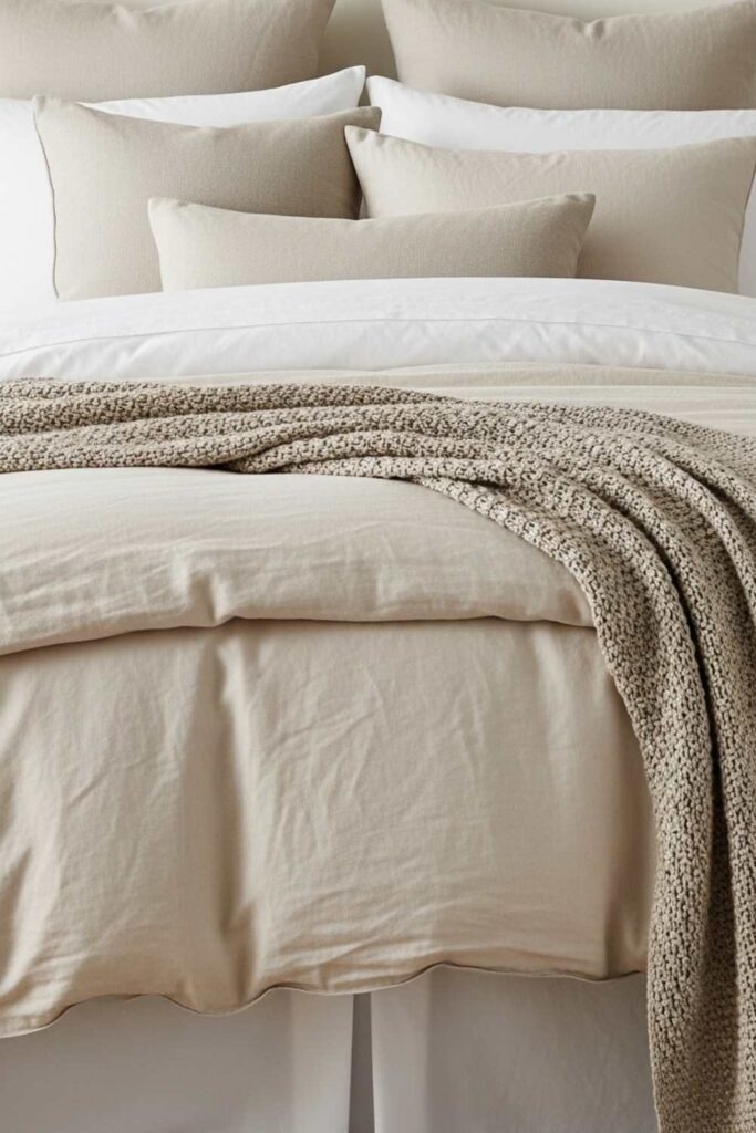 Texture plays an important role in making neutral spaces feel warm rather than flat. Linen, cotton, or quilted fabrics help reflect light softly and make the bed feel visually rich. Even a simple bed can look luxurious when fabrics are carefully layered.