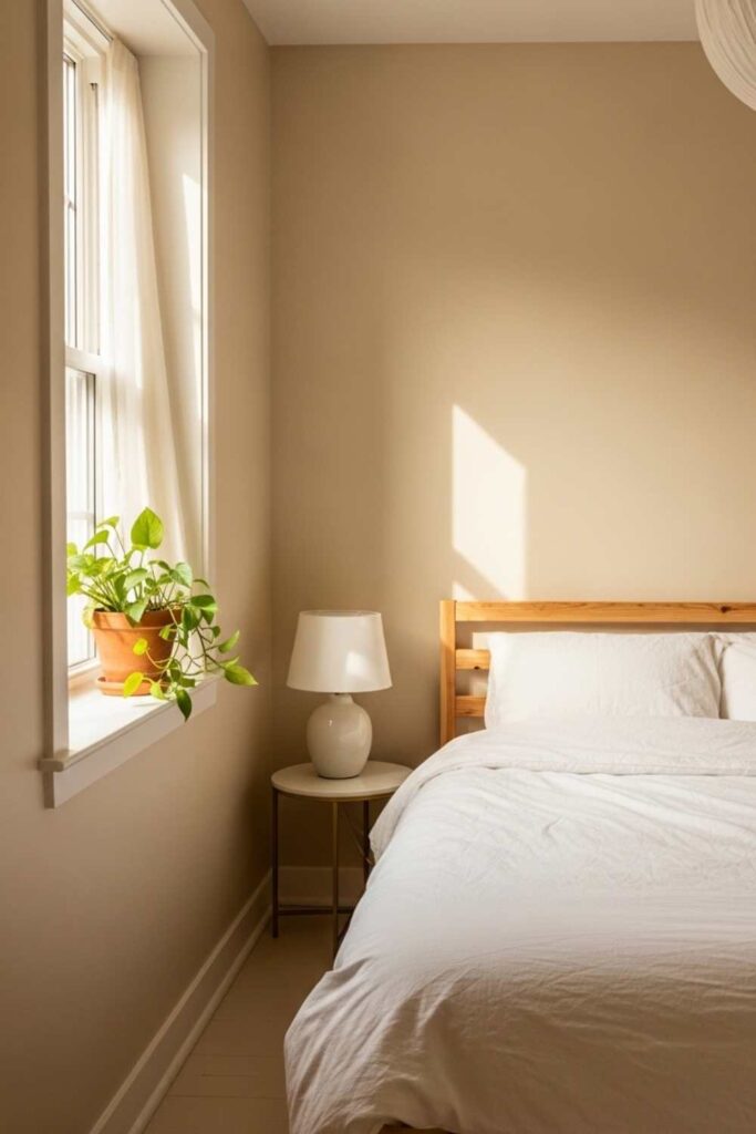 Wall color defines the mood of the entire room. Cream wall tones create warmth while still reflecting light, which helps small bedrooms feel more spacious and open. Soft ivory, warm beige, or muted vanilla shades work beautifully.