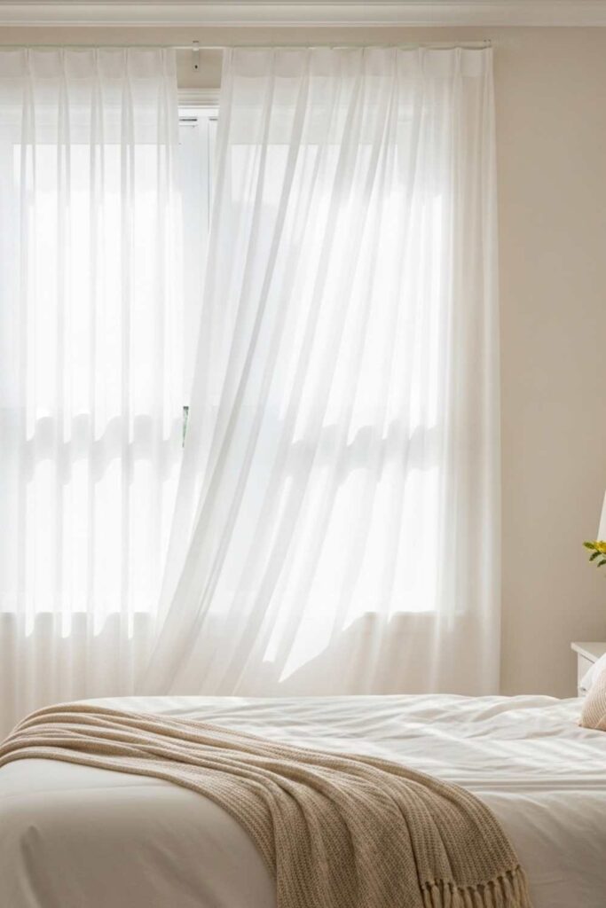 Sheer fabrics help soften window frames and add gentle movement to the space. When paired with cream walls and bedding, they create a seamless and calming color flow.