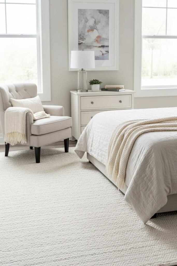 Flooring often gets overlooked in bedroom design, but rugs play a crucial role in comfort. A soft white or cream rug adds warmth underfoot and visually anchors the furniture.