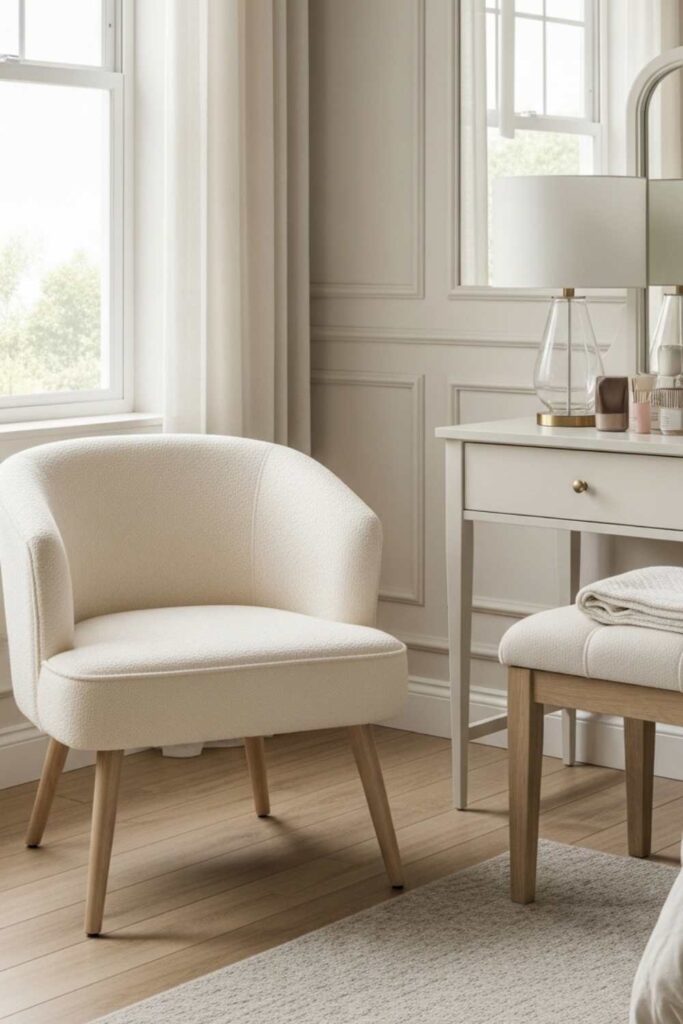 In modern cream and white bedroom decor, accent seating often becomes a quiet luxury element that makes the bedroom feel more complete and functional.