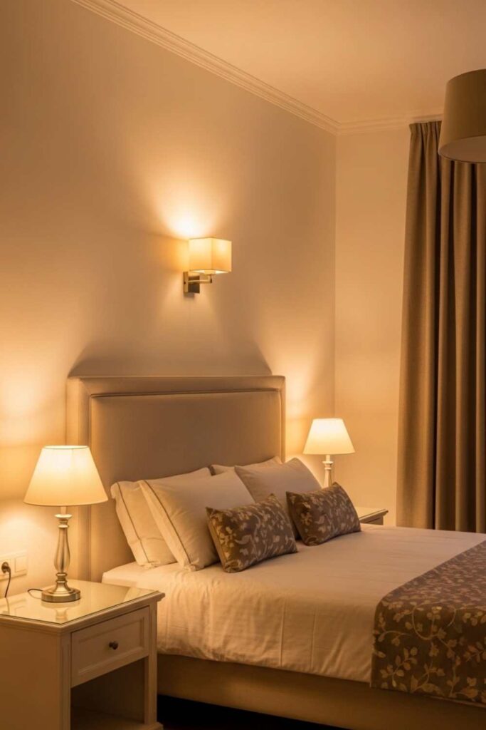 Lighting determines how a bedroom feels in the evening. Warm bedside lamps, wall sconces, and indirect lighting create a gentle glow that supports relaxation and better sleep.