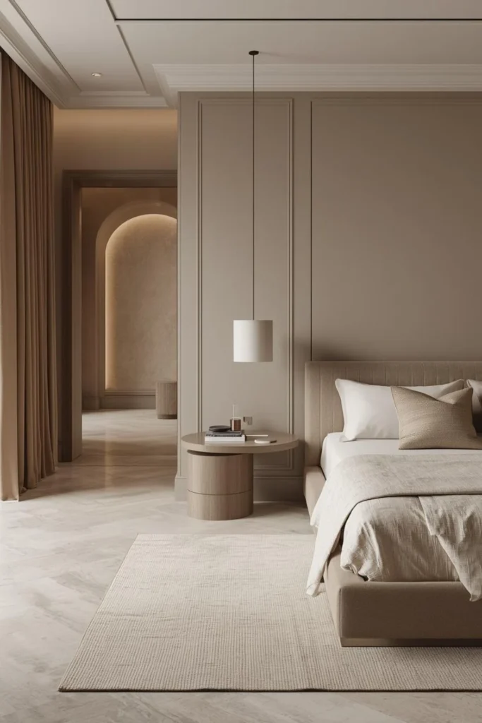 Soft neutrals, warm greys, beige tones, and muted earth shades create a calm and elegant luxury atmosphere.