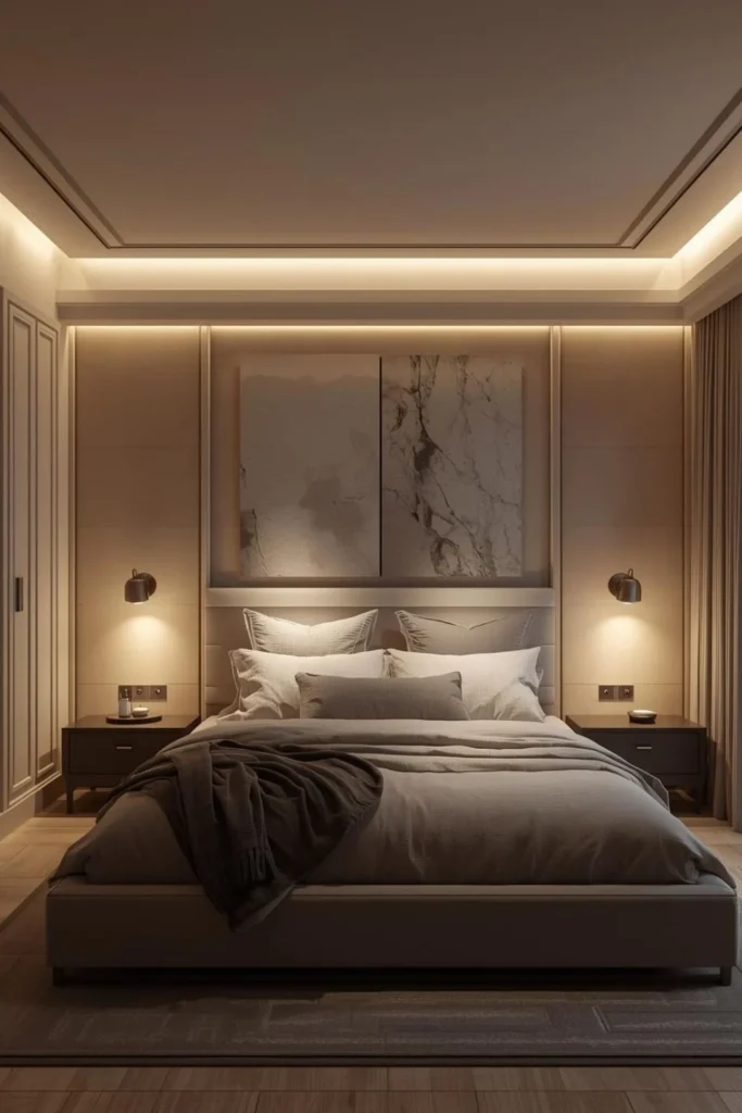 Lighting plays a central role in shaping modern luxury bedroom design ideas. Instead of harsh brightness, luxury bedrooms use layered, warm lighting to create mood. Soft ceiling lights, bedside lamps, and subtle accent lighting work together to create a calm atmosphere.