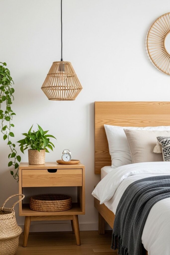 Natural materials help bedrooms feel grounded and calm. Wood textures, cotton fabrics, woven baskets, and small indoor plants introduce warmth without overwhelming the space.
