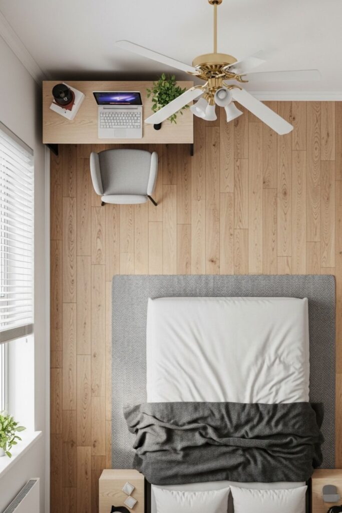 Avoid placing work desks directly beside the bed if possible. Separating sleep and work areas, even slightly, helps the mind associate the bed with rest rather than activity.