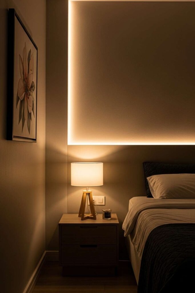 Layered lighting creates flexibility and emotional comfort. A soft bedside lamp, warm wall lighting, or indirect LED strips create a gentle glow that supports relaxation. These light sources reduce eye strain and signal the brain that it is time to unwind.