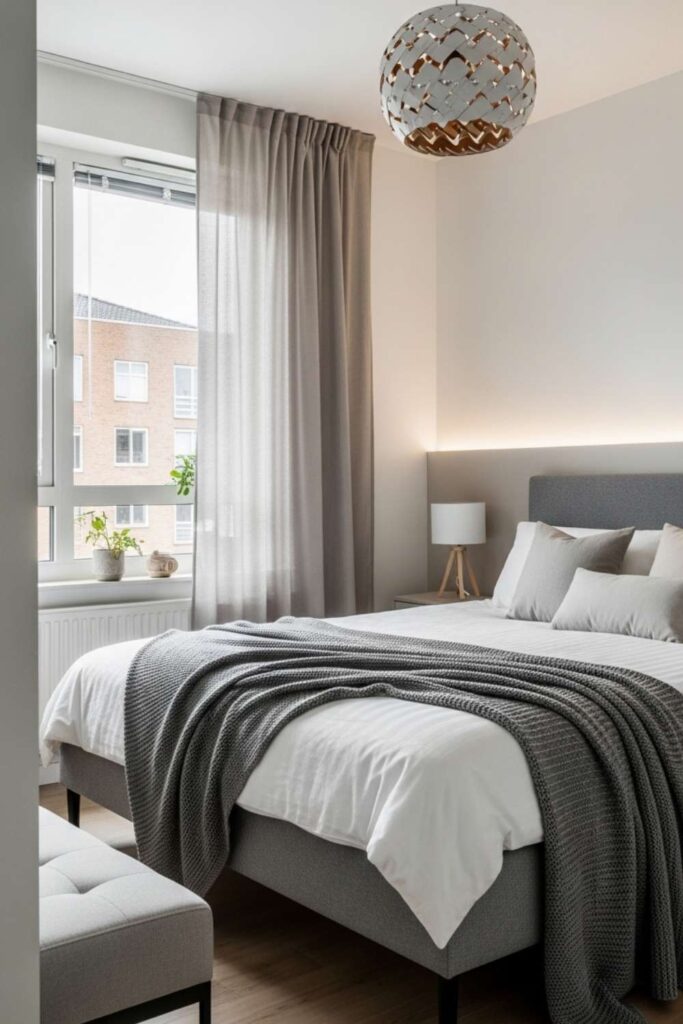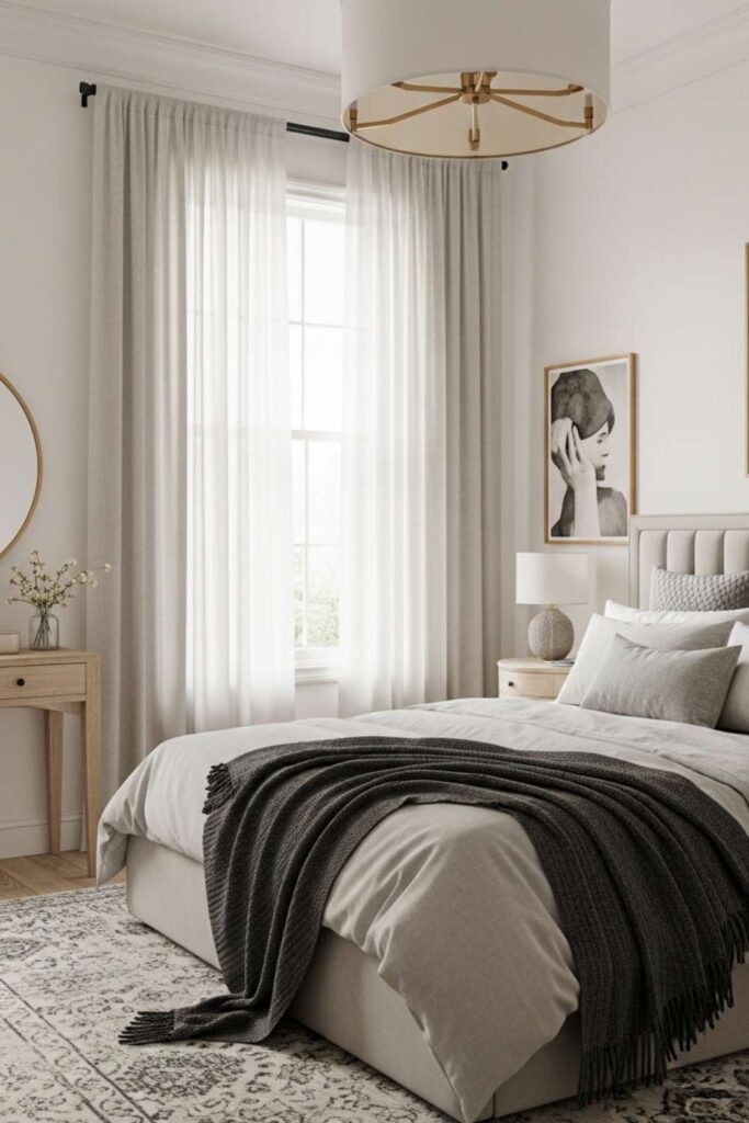 Using sheer curtains instead of heavy drapes allows light to enter while maintaining privacy. This keeps the bedroom feeling open during the day and softly lit in the morning.